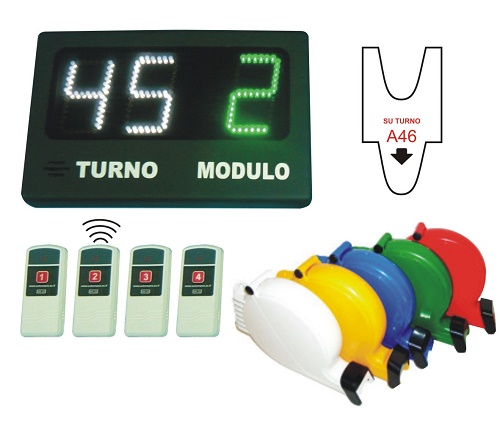 Turnero electrónico con pulsadores inalámbricos, soporta hasta 8 control remotos, los tickets se toman de un dispensador tipo caracol, disponibles en varios colores.